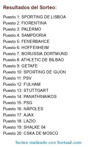 Lista de participantes: HOFFENHEIM, BORUSSIA DORTMUND, SHALKE 04, STUTTGART, ATHLETIC DE BILBAO, GETAFE, PSG, AJAX, PSV, FULHAM, FIORENTINA, LAZIO, NÁPOLES, PALERMO, SAMPDORIA, SPORTING DE LISBOA, PANATHINAIKOS, CSKA DE MOSCÚ, FENERBAHCE, SPORTING DE GIJON.