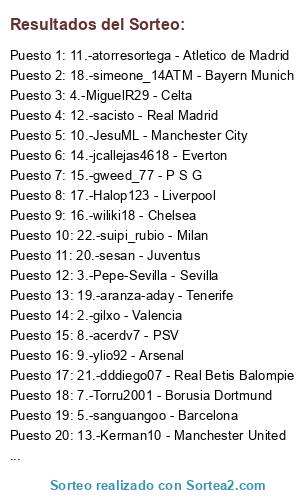 Lista de participantes: 1.-Jose1979rml - Elche, 2.-gilxo - Valencia, 3.-Pepe-Sevilla - Sevilla, 4.-MiguelR29 - Celta, 5.-sanguangoo - Barcelona, 6.-Dikens - Leganes, 7.-Torru2001 - Borusia Dortmund, 8.-acerdv7 - PSV, 9.-ylio92 - Arsenal, 10.-JesuML - Manchester City, 11.-atorresortega - Atletico de Madrid, 12.-sacisto - Real Madrid, 13.-Kerman10 - Manchester United, 14.-jcallejas4618 - Everton, 15.-gweed_77 - P S G, 16.-wiliki18 - Chelsea, 17.-Halop123 - Liverpool, 18.-simeone_14ATM - Bayern Munich, 19.-aranza-aday - Tenerife, 20.-sesan - Juventus, 21.-dddiego07 - Real Betis Balompie, 22.-suipi_rubio - Milan, 23.-nacaan - Newcastle, 24.-nadie34567 - Schalke 04, 25.-the_bestia2 - Las Palmas, 26.-mikykko - Real Club Deportivo de la Coruña.