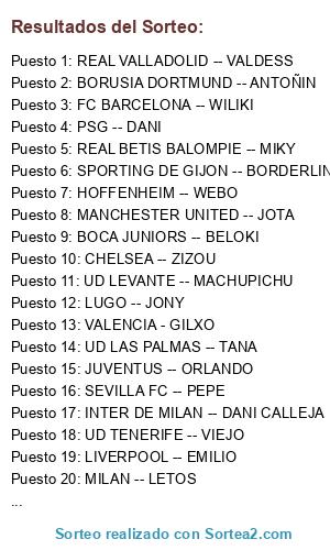 Lista de participantes: UD TENERIFE -- VIEJO, JUVENTUS -- ORLANDO, SPORTING DE GIJON -- BORDERLINE, LUGO -- JONY, REAL OVIEDO -- SOU, VALENCIA - GILXO, UD LEVANTE -- MACHUPICHU, BOCA JUNIORS -- BELOKI, MANCHESTER CITY -- RUBIO, MILAN -- LETOS, HOFFENHEIM -- WEBO, UD LAS PALMAS -- TANA, FC BARCELONA -- WILIKI, PSG -- DANI, REAL VALLADOLID -- VALDESS, BORUSIA DORTMUND -- ANTOÑIN, REAL BETIS BALOMPIE -- MIKY, SEVILLA FC -- PEPE, LIVERPOOL -- EMILIO, MANCHESTER UNITED -- JOTA, INTER DE MILAN -- DANI CALLEJA, CHELSEA -- ZIZOU.