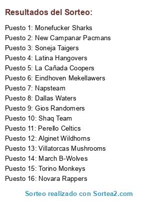 Lista de participantes: March B-Wolves(2 participaciones), Dallas Waters(2 participaciones), New Campanar Pacmans(2 participaciones), Shaq Team(2 participaciones), Villatorcas Mushrooms(2 participaciones), Monefucker Sharks(2 participaciones), Latina Hangovers(2 participaciones), Napsteam(2 participaciones), Eindhoven Mekellawers(2 participaciones), Gios Randomers(2 participaciones), Torino Monkeys(2 participaciones), Alginet Wildhorns(2 participaciones), Perello Celtics(2 participaciones), Soneja Taigers(2 participaciones), La Cañada Coopers, Novara Rappers.