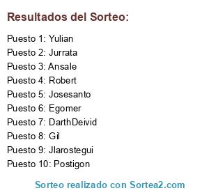 Lista de participantes: DarthDeivid, Egomer, Ansale, Gil, Robert, Jlarostegui, Postigon, Josesanto, Jurrata, Yulian.