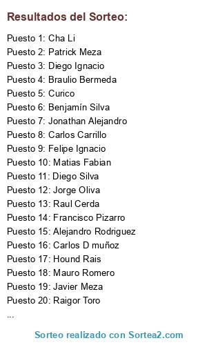 Lista de participantes: Diego Ignacio, Matias Fabian, Carlos Carrillo, Jorge Oliva, Alejandro Rodriguez, Eric Alejandro, Mauro Romero, Felipe Alvarez, Diego Silva, Raigor Toro, Jonathan Alejandro, Sknhd Contreras, Felipe Ignacio, Gonzalo Castro, Carlos D muñoz, Raul Cerda, Cha Li, Javier Meza, Hound Rais, Braulio Bermeda, Francisco Pizarro, Patrick Meza, Curico, Benjamín Silva.