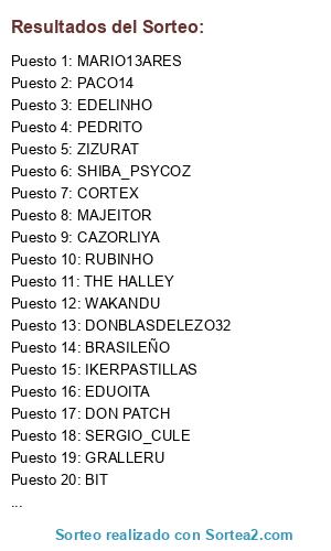 Lista de participantes: ZIZURAT, BRASILEÑO, BIT, IKERPASTILLAS, PACO14, CAZORLIYA, LAKYLU, PEDRITO, CORTEX, SERGIO_CULE, RUBINHO, EDUOITA, EDELINHO, SHIBA_PSYCOZ, MAJEITOR, IMPARABLE, GRALLERU, SAPINHO, NACH, DONBLASDELEZO32, MARIO13ARES, WAKANDU, DON PATCH, THE HALLEY.