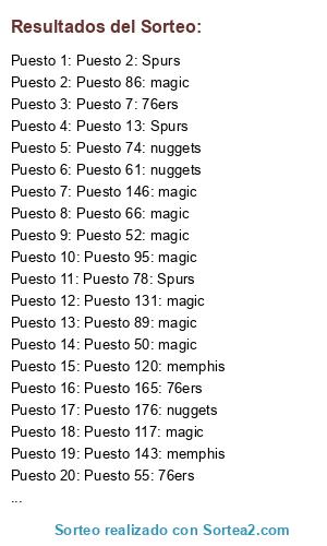Lista de participantes: Puesto 1: Spurs, Puesto 2: Spurs, Puesto 3: 76ers, Puesto 4: 76ers, Puesto 5: memphis, Puesto 6: magic, Puesto 7: 76ers, Puesto 8: magic, Puesto 9: memphis, Puesto 10: 76ers, Puesto 11: memphis, Puesto 12: magic, Puesto 13: Spurs, Puesto 14: magic, Puesto 15: magic, Puesto 16: memphis, Puesto 17: Spurs, Puesto 18: 76ers, Puesto 19: magic, Puesto 20: magic, Puesto 21: 76ers, Puesto 22: Spurs, Puesto 23: 76ers, Puesto 24: nuggets, Puesto 25: 76ers, Puesto 26: magic, Puesto 27: memphis, Puesto 28: memphis, Puesto 29: memphis, Puesto 30: magic, Puesto 31: Spurs, Puesto 32: 76ers, Puesto 33: magic, Puesto 34: Spurs, Puesto 35: Spurs, Puesto 36: 76ers, Puesto 37: Spurs, Puesto 38: Spurs, Puesto 39: magic, Puesto 40: 76ers, Puesto 41: magic, Puesto 42: nuggets, Puesto 43: nuggets, Puesto 44: magic, Puesto 45: Spurs, Puesto 46: Spurs, Puesto 47: magic, Puesto 48: 76ers, Puesto 49: nuggets, Puesto 50: magic, Puesto 51: magic, Puesto 52: magic, Puesto 53: nuggets, Puesto 54: memphis, Puesto 55: 76ers, Puesto 56: memphis, Puesto 57: memphis, Puesto 58: magic, Puesto 59: 76ers, Puesto 60: nuggets, Puesto 61: nuggets, Puesto 62: nuggets, Puesto 63: magic, Puesto 64: magic, Puesto 65: magic, Puesto 66: magic, Puesto 67: magic, Puesto 68: 76ers, Puesto 69: memphis, Puesto 70: Spurs, Puesto 71: 76ers, Puesto 72: magic, Puesto 73: Spurs, Puesto 74: nuggets, Puesto 75: magic, Puesto 76: magic, Puesto 77: magic, Puesto 78: Spurs, Puesto 79: magic, Puesto 80: 76ers, Puesto 81: 76ers, Puesto 82: 76ers, Puesto 83: 76ers, Puesto 84: memphis, Puesto 85: magic, Puesto 86: magic, Puesto 87: Spurs, Puesto 88: 76ers, Puesto 89: magic, Puesto 90: nuggets, Puesto 91: memphis, Puesto 92: Spurs, Puesto 93: magic, Puesto 94: memphis, Puesto 95: magic, Puesto 96: magic, Puesto 97: nuggets, Puesto 98: magic, Puesto 99: magic, Puesto 100: memphis, Puesto 101: Spurs, Puesto 102: magic, Puesto 103: magic, Puesto 104: magic, Puesto 105: magic, Puesto 106: Spurs, Puesto 107: memphis, Puesto 108: nuggets, Puesto 109: 76ers, Puesto 110: memphis, Puesto 111: nuggets, Puesto 112: magic, Puesto 113: magic, Puesto 114: memphis, Puesto 115: 76ers, Puesto 116: magic, Puesto 117: magic, Puesto 118: memphis, Puesto 119: nuggets, Puesto 120: memphis, Puesto 121: magic, Puesto 122: 76ers, Puesto 123: Spurs, Puesto 124: Spurs, Puesto 125: memphis, Puesto 126: magic, Puesto 127: magic, Puesto 128: magic, Puesto 129: memphis, Puesto 130: magic, Puesto 131: magic, Puesto 132: magic, Puesto 133: magic, Puesto 134: Spurs, Puesto 135: magic, Puesto 136: Spurs, Puesto 137: magic, Puesto 138: magic, Puesto 139: Spurs, Puesto 140: Spurs, Puesto 141: Spurs, Puesto 142: magic, Puesto 143: memphis, Puesto 144: magic, Puesto 145: nuggets, Puesto 146: magic, Puesto 147: memphis, Puesto 148: Spurs, Puesto 149: Spurs, Puesto 150: magic, Puesto 151: nuggets, Puesto 152: 76ers, Puesto 153: magic, Puesto 154: magic, Puesto 155: Spurs, Puesto 156: nuggets, Puesto 157: magic, Puesto 158: 76ers, Puesto 159: Spurs, Puesto 160: magic, Puesto 161: magic, Puesto 162: magic, Puesto 163: 76ers, Puesto 164: magic, Puesto 165: 76ers, Puesto 166: Spurs, Puesto 167: magic, Puesto 168: 76ers, Puesto 169: nuggets, Puesto 170: magic, Puesto 171: magic, Puesto 172: magic, Puesto 173: Spurs, Puesto 174: magic, Puesto 175: 76ers, Puesto 176: nuggets, Puesto 177: 76ers, Puesto 178: Spurs, Puesto 179: memphis, Puesto 180: magic, Puesto 181: magic, Puesto 182: magic, Puesto 183: Spurs, Puesto 184: nuggets, Puesto 185: Spurs.