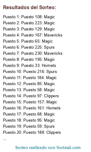 Lista de participantes: Puesto 1: Magic, Puesto 2: Magic, Puesto 3: Magic, Puesto 4: Clippers, Puesto 5: Magic, Puesto 6: Magic, Puesto 7: Mavericks, Puesto 8: Hornets, Puesto 9: Magic, Puesto 10: Magic, Puesto 11: Hornets, Puesto 12: Mavericks, Puesto 13: Clippers, Puesto 14: Mavericks, Puesto 15: Spurs, Puesto 16: Magic, Puesto 17: Magic, Puesto 18: Magic, Puesto 19: Magic, Puesto 20: Clippers, Puesto 21: Magic, Puesto 22: Magic, Puesto 23: Magic, Puesto 24: Magic, Puesto 25: Hornets, Puesto 26: Magic, Puesto 27: Magic, Puesto 28: Magic, Puesto 29: Magic, Puesto 30: Magic, Puesto 31: Magic, Puesto 32: Hornets, Puesto 33: Hornets, Puesto 34: Magic, Puesto 35: Spurs, Puesto 36: Clippers, Puesto 37: Magic, Puesto 38: Magic, Puesto 39: Hornets, Puesto 40: Magic, Puesto 41: Mavericks, Puesto 42: Magic, Puesto 43: Spurs, Puesto 44: Magic, Puesto 45: Magic, Puesto 46: Magic, Puesto 47: Clippers, Puesto 48: Magic, Puesto 49: Magic, Puesto 50: Magic, Puesto 51: Spurs, Puesto 52: Magic, Puesto 53: Magic, Puesto 54: Hornets, Puesto 55: Magic, Puesto 56: Magic, Puesto 57: Magic, Puesto 58: Magic, Puesto 59: Spurs, Puesto 60: Magic, Puesto 61: Magic, Puesto 62: Magic, Puesto 63: Spurs, Puesto 64: Clippers, Puesto 65: Magic, Puesto 66: Mavericks, Puesto 67: Magic, Puesto 68: Magic, Puesto 69: Magic, Puesto 70: Magic, Puesto 71: Magic, Puesto 72: Spurs, Puesto 73: Hornets, Puesto 74: Magic, Puesto 75: Magic, Puesto 76: Spurs, Puesto 77: Magic, Puesto 78: Magic, Puesto 79: Magic, Puesto 80: Magic, Puesto 81: Magic, Puesto 82: Magic, Puesto 83: Magic, Puesto 84: Hornets, Puesto 85: Magic, Puesto 86: Magic, Puesto 87: Magic, Puesto 88: Magic, Puesto 89: Magic, Puesto 90: Spurs, Puesto 91: Magic, Puesto 92: Spurs, Puesto 93: Magic, Puesto 94: Magic, Puesto 95: Magic, Puesto 96: Magic, Puesto 97: Clippers, Puesto 98: Magic, Puesto 99: Mavericks, Puesto 100: Spurs, Puesto 101: Magic, Puesto 102: Magic, Puesto 103: Magic, Puesto 104: Magic, Puesto 105: Magic, Puesto 106: Spurs, Puesto 107: Hornets, Puesto 108: Magic, Puesto 109: Magic, Puesto 110: Hornets, Puesto 111: Magic, Puesto 112: Spurs, Puesto 113: Magic, Puesto 114: Magic, Puesto 115: Magic, Puesto 116: Magic, Puesto 117: Magic, Puesto 118: Magic, Puesto 119: Hornets, Puesto 120: Hornets, Puesto 121: Hornets, Puesto 122: Magic, Puesto 123: Hornets, Puesto 124: Magic, Puesto 125: Spurs, Puesto 126: Magic, Puesto 127: Spurs, Puesto 128: Magic, Puesto 129: Magic, Puesto 130: Magic, Puesto 131: Magic, Puesto 132: Magic, Puesto 133: Magic, Puesto 134: Hornets, Puesto 135: Clippers, Puesto 136: Magic, Puesto 137: Spurs, Puesto 138: Spurs, Puesto 139: Clippers, Puesto 140: Mavericks, Puesto 141: Magic, Puesto 142: Spurs, Puesto 143: Magic, Puesto 144: Hornets, Puesto 145: Magic, Puesto 146: Magic, Puesto 147: Hornets, Puesto 148: Magic, Puesto 149: Hornets, Puesto 150: Magic, Puesto 151: Hornets, Puesto 152: Magic, Puesto 153: Spurs, Puesto 154: Mavericks, Puesto 155: Magic, Puesto 156: Magic, Puesto 157: Magic, Puesto 158: Magic, Puesto 159: Hornets, Puesto 160: Magic, Puesto 161: Hornets, Puesto 162: Magic, Puesto 163: Magic, Puesto 164: Magic, Puesto 165: Magic, Puesto 166: Magic, Puesto 167: Mavericks, Puesto 168: Magic, Puesto 169: Magic, Puesto 170: Magic, Puesto 171: Magic, Puesto 172: Magic, Puesto 173: Magic, Puesto 174: Magic, Puesto 175: Magic, Puesto 176: Magic, Puesto 177: Spurs, Puesto 178: Magic, Puesto 179: Clippers, Puesto 180: Magic, Puesto 181: Clippers, Puesto 182: Magic, Puesto 183: Magic, Puesto 184: Magic, Puesto 185: Magic, Puesto 186: Magic, Puesto 187: Mavericks, Puesto 188: Clippers, Puesto 189: Spurs, Puesto 190: Magic, Puesto 191: Hornets, Puesto 192: Magic, Puesto 193: Mavericks, Puesto 194: Magic, Puesto 195: Magic, Puesto 196: Mavericks, Puesto 197: Magic, Puesto 198: Magic, Puesto 199: Magic, Puesto 200: Clippers, Puesto 201: Magic, Puesto 202: Magic, Puesto 203: Magic, Puesto 204: Magic, Puesto 205: Mavericks, Puesto 206: Clippers, Puesto 207: Magic, Puesto 208: Magic, Puesto 209: Magic, Puesto 210: Magic, Puesto 211: Spurs, Puesto 212: Magic, Puesto 213: Magic, Puesto 214: Hornets, Puesto 215: Magic, Puesto 216: Spurs, Puesto 217: Magic, Puesto 218: Mavericks, Puesto 219: Magic, Puesto 220: Magic, Puesto 221: Hornets, Puesto 222: Magic, Puesto 223: Magic, Puesto 224: Spurs, Puesto 225: Spurs, Puesto 226: Clippers, Puesto 227: Magic, Puesto 228: Magic, Puesto 229: Mavericks, Puesto 230: Mavericks, Puesto 231: Magic, Puesto 232: Magic, Puesto 233: Magic, Puesto 234: Spurs, Puesto 235: Mavericks, Puesto 236: Hornets, Puesto 237: Hornets, Puesto 238: Clippers, Puesto 239: Magic, Puesto 240: Magic, Puesto 241: Spurs, Puesto 242: Spurs, Puesto 243: Magic, Puesto 244: Spurs, Puesto 245: Magic, Puesto 246: Spurs, Puesto 247: Spurs, Puesto 248: Hornets, Puesto 249: Magic, Puesto 250: Magic, Puesto 251: Magic, Puesto 252: Magic, Puesto 253: Magic, Puesto 254: Magic, Puesto 255: Magic, Puesto 256: Magic, Puesto 257: Hornets, Puesto 258: Magic, Puesto 259: Clippers, Puesto 260: Magic, Puesto 261: Magic, Puesto 262: Mavericks, Puesto 263: Magic, Puesto 264: Magic, Puesto 265: Magic, Puesto 266: Spurs, Puesto 267: Magic.