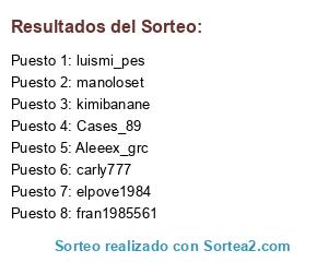Lista de participantes: carly777, Cases_89, fcb87, Malasombra21, manoloset, marlito12, Mgs_f16, NINOLG18, PEP_TEAM1989, SirBryan23, trebolshimbi, TrueKira88, Aleeex_grc, BlindCat91, elpove1984, fran1985561, jliy0, joselito3489, LM1989GR, Mr-trugnte, penha69, raaaaaaaay9rarar, rafabarba7, urketti46, Alcuilla_, ELjugarre_tas, Fer_don3p, jose-cartama, KILY-CHARRUA, kimibanane, luismi_pes, maskyrojillo, miky_jandra, minpucher, nina93003, SCalventeS.