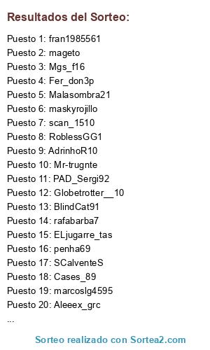 Lista de participantes: AdrinhoR10, Aleeex_grc, Alex_ramos2, BlindCat91, byelera, carly777, Cases_89, Damiolp18, ELjugarre_tas, elpove1984, fcb87, Fer_don3p, fran1985561, Globetrotter__10, jahc77tenerife, jliy0, jose-cartama, joselito3489, kion-_-jr, Labestianegra_10, LM1989GR, luismi_pes, mageto, Malasombra21, manoloset, marcoslg4595, marlito12, maskyrojillo, messiano, Mgs_f16, Mr-trugnte, NINOLG18, PAD_Sergi92, penha69, PEP_TEAM1989, Perdy27, pyros1990, raaaaaaaay9rarar, rafabarba7, RoblessGG1, RubifumY, SCalventeS, scan_1510, SirBryan23, Sr_Osquitar, trebolshimbi, TrueKira88, urketti46.