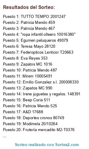 Lista de participantes: Tuttotempo 2001222, Idea olivera Tc/8398, Idea Olivera C/2752, Dovana 2257, El principito 4614, LUNA 2-026886, Patricia Mendo 437, TUTTO TEMPO 2001223, Eva Reyes moda y complementos 299, Retales fran 6648, Patricia Mendo 438, Idea olivera 530001, ROPA INFANTIL OLLERO 10016313, PATRICIA MENDO 439, LUNA 2-026887, LUNA 2-026888, Idea olivera C2754, Patricia mendo 440, Luna 2-026889, Retales Fran 6652, Le Velours 1260, Juguetería irene 148325, IDEA OLIVERA TC/8406, Aguja de oro 15465, Le Velours 285, Luna 2-026890, Carlos joyeros 978, Irene Juguetes y Regalos (04-12-2020) 5, ROPA INFANTIL OLLERO 10016314, Ana floristería 3973, Cortinas molina 6997, Nutrición Mascota 74728, ROPA INFANTIL OLLERO 10016315, Idea olivera C/2756, Luna 2-026891, Flichi shop 1157, Juguetería Irene 000007/04-12-2020, Luna 2-026892, ROPA INFANTIL OLLERO 10016316, Luna 2-026893, Coquetos 2-002652, Coquetos 2-002651, ROPA INFANTIL OLLERO 10016317, Coquetos 2-002650, Patricia Mendo 441, Nutrición Mascota C.I.F. 6995930C, Retales Fran 6650, Patricia Mendi 442, Librería El Principito 4617, Librería El Principito 4616, Zapatos MC 885, Nutrición Mascota 74725, Sabbar Atman 3, Colorín colorado 2722, ROPA INFANTIL OLLERO 10016319, Sensación digital 1504, Le Velours 1262, Merceria y lenceria labores 90665, Nutrición Mascotas TK\74730, BAZAR SABBAR 3, ROPA INFANTIL OLLERO 10016320, Coquetos 2-002653, Frutería disfruta T0218, Cortinas Molina 7023, Confecciones Aurelio 564, ROPA INFANTIL OLLERO 10016321, Colorín Colorado 2723, Coquetos 2-002647, Colorin colorado 2720, MILENIUM 5680523730, Peluquería Bravo 608, "ROPA INFANTIL OLALLA 10016322", Cortinas Molina 7029, Juguetería irene 148329, Aguja de oro 15471, Jugueteria pamda 1414, Le Velours 1263, Bellafarma T19/4031, Jugueteria pamda 1415, Bellafarma T19/4030, Retales Fran 6638, Bellafarma T19/4029, Bellafarma T19/4028, Zapatería Abracadabra 2650, Bellafarma T19/4027, Bellafarma T19/4025, Bellafarma T19/4026, Sabbar Atman 2821, Sabbar Atman 2824, ABRACADABRA Zapatería infantil 2649, Juguetería Irene 148324/04/12/2020, Libreria el principito 4618, Beep 001/003116, Dovana 2264, Bellafarma T19/4022, Luna 2-026894, Nutrición Mascotas 74732, Egumen peluqueros 49065, Egumen peluquwros 49066, Calzados M.C. 888, ABRACADABRA zapatería infantil 2658, DOVANA 2267, MILENIUM 5680523870, Retales Fran 6635, Dovana 2261, Juguetería Irene 000014. 04-12-2020, Juguetería Pamda 1413, Peluquería Bravo 609, Deportes Cronos 260748, SPORT FISHING 3560, SPORT FISHING 3562, Idea Oliveira 8407, Tienda Polo TC5/82622, Eva Reyes 303, Eva Reyes 304, Idea Olivera TC/ 8417, Retales Fran 6646, Idea Olivera TC 8418, Libreros Naroga 3614, Bazar sabbar Atman 2827, Cortinas Molina 7043, Ana floristería 3975, Confecciones Aurelio 568, Electrodomésticos Idea Olivera 2.748/C, Eva Reyes 305, TIENDA POLO TC5/82625, Nutrición mascota Tr/74735, SENSACION DIGITAL S20/000000011837, El mundo del niño 22550, Aguja de oro 15472, Confecciones Aurelio 569, Patricia Mendo 443, Eva Reyes 307, Eva Reyes 308, Teresa Mayo 28056, tienda polo TC5/82626, "ROPA INFANTIL OLLERO 100116324", Milenium 5680523900, Peluquería Bravo 610, Pinturas moncar 4468, Patricia Mendo 444, Juguetería pamda 1417, Juguetería pamda 1418, Teresa Mayo 28054, Milenium 5680523910, Sabbar Atman 2829, Juguetería pamda 1419, Nutrición mascotas 74736, Coquetos 2-002654, Juguetería Irene 000020/04-12-2020, "Modimel. La T092ac890010000", LUNA 2-026897, Le Velours 288, EGUMEN PELUQUEROS 49062, Tienda POLO Tc5/82627, Gandariaa 167355, Librería naroga 3617, Retales Fran 6718, Naroga 3618, Idea olivera 8421, Nutrición Mascotas 74739, Librería Naroga 3619, "Idea olivera Tc8422, Fruteria disfruta M1-T0216, Idea olivera TC8426, naroga libreria 202006023, Tienda POLO Tc5/82629, COQUETOS 2-002656, Tienda POLO Tc5/82630, LIBRERIA NAROGA 202006026, "ropa infantil ollero 10016325", Zapateria Abracadabra 2660, INFINITY 10001831, "ROPA INFANTIL OLLERO 10016326", LIBRERÍA NAROGA 3,62, ROPA INFANTIL OLLERO 10016327, Le Velours 1265, Nutricion mascotas 74745, luna 2-026898, luna 2-026899, nutrición mascotas TK/74738, Electrocash 72715, Electrocash 72727, Electrocash 72724, COLORIN COLORADO 2 002728, Abracadabra 2661, nutrición mascotas 74746, Idea coria TC 8427, Tienda Polo TC5/82631, Coquetos 2-002657, Pinturas Moncar 2-004473, Luna 2-026901, Sport fishing 3574, CORTINAS MOLINA 7050, Levelours 1-001266, El mundo del niño 22610, Le velours 1-001267, Comercial Pacheco 1280, Comercial Pacheco 1281, La casita de lara 1134, Egumen peluqueros 49075, Tienda polo TC5/82632, Patricia Mendo 446, Retales Fran 6698, Retales Fran 6662, Abracadabra 2662, Idea olivera 8429, Tienda POLO Tc5/82633, SENSACION DIGITAL 2-001506, EL MUNDO DEL NIÑO 22609, Teresa Mayo 28057, DEPORTES CRONOS CRO/260780, ROPA INFANTIL OLLERO 10016328, Retales fran 6726, LUNA 2-026902, Idea Olivera TC/8425, Carlos Joyeros T/983, Idea Olivera TC/8426, Carlos Joyeros T/982, Lamparas Isabel 4, Lamparaa Isabel 1, Idea Olivera Tc8430, Abracadabra 2651, Colorín colorado 2732, Sensacion digital 2-001507, Nutrición mascotas 74748, ROPA INFANTIL OLLERO 10016329, Abracadabra zapateria 2664, Nutrición mascotas 74750, Nutrición mascotas 74751, Retales fran 6746, Tiendas Polo TC5/82628, AyD 17560, Librería naroga 3613, Retales Fran 6757, Cortinas Molina 6988, Retales Fran 6641, Deportes cronos CRO/260753, Carlos Joyeros T/979, Comercial Pacheco 1-001276, Ámbar 138, Le velours 1-000290, Nutrición mascotas 74753, Nutricion y mascotas 74755, Colorin colorado 2727, Colorin colorado 2721, A&D moda infantil 17546, Frutería mercadito M1-T0270, NUTRICION MASCOTAS 74754, Retales Fran 6665, Carlos joyeros T/980, Bellafarma T19/4040, BELLAFARMA 4040, Le Velours 1264, Carlos Joyeros 980, Retales Fran 6739, Deportes cronos 260747, Abracadabra 2659, A&D 17556, JUGUETERÍA PAMDA 1421, Retales Fran 6724, Federopticos Lenticor T20632, Retales fran 6751, Retales Fran 6754, Libreria El 