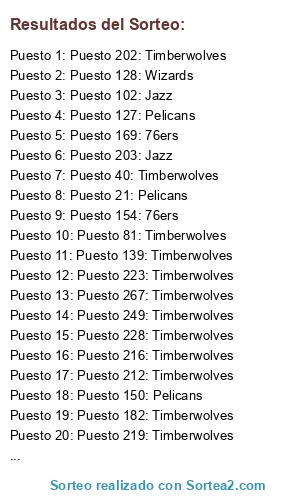 Lista de participantes: Puesto 1: Clippers, Puesto 2: Timberwolves, Puesto 3: Timberwolves, Puesto 4: Timberwolves, Puesto 5: Jazz, Puesto 6: Timberwolves, Puesto 7: Timberwolves, Puesto 8: Wizards, Puesto 9: Timberwolves, Puesto 10: Timberwolves, Puesto 11: Wizards, Puesto 12: Timberwolves, Puesto 13: 76ers, Puesto 14: Timberwolves, Puesto 15: Timberwolves, Puesto 16: Timberwolves, Puesto 17: Jazz, Puesto 18: 76ers, Puesto 19: Timberwolves, Puesto 20: Timberwolves, Puesto 21: Pelicans, Puesto 22: 76ers, Puesto 23: Timberwolves, Puesto 24: Timberwolves, Puesto 25: Timberwolves, Puesto 26: Timberwolves, Puesto 27: 76ers, Puesto 28: Timberwolves, Puesto 29: Clippers, Puesto 30: Timberwolves, Puesto 31: Timberwolves, Puesto 32: Timberwolves, Puesto 33: Timberwolves, Puesto 34: Timberwolves, Puesto 35: Pelicans, Puesto 36: Timberwolves, Puesto 37: Pelicans, Puesto 38: 76ers, Puesto 39: Timberwolves, Puesto 40: Timberwolves, Puesto 41: 76ers, Puesto 42: Timberwolves, Puesto 43: Timberwolves, Puesto 44: Timberwolves, Puesto 45: Timberwolves, Puesto 46: Wizards, Puesto 47: Timberwolves, Puesto 48: Wizards, Puesto 49: Timberwolves, Puesto 50: Clippers, Puesto 51: Wizards, Puesto 52: 76ers, Puesto 53: Timberwolves, Puesto 54: Timberwolves, Puesto 55: Clippers, Puesto 56: Timberwolves, Puesto 57: Timberwolves, Puesto 58: Timberwolves, Puesto 59: Timberwolves, Puesto 60: Wizards, Puesto 61: Pelicans, Puesto 62: Timberwolves, Puesto 63: Timberwolves, Puesto 64: 76ers, Puesto 65: Timberwolves, Puesto 66: Timberwolves, Puesto 67: Timberwolves, Puesto 68: Timberwolves, Puesto 69: Timberwolves, Puesto 70: 76ers, Puesto 71: Timberwolves, Puesto 72: Timberwolves, Puesto 73: Timberwolves, Puesto 74: Wizards, Puesto 75: Timberwolves, Puesto 76: Pelicans, Puesto 77: Wizards, Puesto 78: Timberwolves, Puesto 79: Clippers, Puesto 80: Timberwolves, Puesto 81: Timberwolves, Puesto 82: Timberwolves, Puesto 83: Jazz, Puesto 84: Timberwolves, Puesto 85: Timberwolves, Puesto 86: Timberwolves, Puesto 87: Timberwolves, Puesto 88: Timberwolves, Puesto 89: Timberwolves, Puesto 90: Timberwolves, Puesto 91: Jazz, Puesto 92: Timberwolves, Puesto 93: Wizards, Puesto 94: Timberwolves, Puesto 95: Timberwolves, Puesto 96: Timberwolves, Puesto 97: Timberwolves, Puesto 98: Jazz, Puesto 99: Timberwolves, Puesto 100: Timberwolves, Puesto 101: Timberwolves, Puesto 102: Jazz, Puesto 103: Timberwolves, Puesto 104: 76ers, Puesto 105: Clippers, Puesto 106: Timberwolves, Puesto 107: Jazz, Puesto 108: Timberwolves, Puesto 109: Timberwolves, Puesto 110: Timberwolves, Puesto 111: Jazz, Puesto 112: Wizards, Puesto 113: 76ers, Puesto 114: Timberwolves, Puesto 115: Timberwolves, Puesto 116: Timberwolves, Puesto 117: Timberwolves, Puesto 118: Timberwolves, Puesto 119: Timberwolves, Puesto 120: Timberwolves, Puesto 121: Timberwolves, Puesto 122: Timberwolves, Puesto 123: Timberwolves, Puesto 124: Timberwolves, Puesto 125: Timberwolves, Puesto 126: Timberwolves, Puesto 127: Pelicans, Puesto 128: Wizards, Puesto 129: 76ers, Puesto 130: Wizards, Puesto 131: Timberwolves, Puesto 132: Clippers, Puesto 133: 76ers, Puesto 134: Wizards, Puesto 135: Timberwolves, Puesto 136: Wizards, Puesto 137: Timberwolves, Puesto 138: Wizards, Puesto 139: Timberwolves, Puesto 140: Pelicans, Puesto 141: Timberwolves, Puesto 142: Clippers, Puesto 143: Timberwolves, Puesto 144: Clippers, Puesto 145: 76ers, Puesto 146: Timberwolves, Puesto 147: Timberwolves, Puesto 148: Jazz, Puesto 149: Timberwolves, Puesto 150: Pelicans, Puesto 151: Timberwolves, Puesto 152: Timberwolves, Puesto 153: Timberwolves, Puesto 154: 76ers, Puesto 155: Timberwolves, Puesto 156: Timberwolves, Puesto 157: Timberwolves, Puesto 158: Timberwolves, Puesto 159: Timberwolves, Puesto 160: Timberwolves, Puesto 161: Timberwolves, Puesto 162: Timberwolves, Puesto 163: Timberwolves, Puesto 164: Timberwolves, Puesto 165: Timberwolves, Puesto 166: 76ers, Puesto 167: Timberwolves, Puesto 168: Timberwolves, Puesto 169: 76ers, Puesto 170: Pelicans, Puesto 171: Wizards, Puesto 172: Timberwolves, Puesto 173: Timberwolves, Puesto 174: Timberwolves, Puesto 175: Jazz, Puesto 176: Timberwolves, Puesto 177: Timberwolves, Puesto 178: Timberwolves, Puesto 179: Timberwolves, Puesto 180: 76ers, Puesto 181: Wizards, Puesto 182: Timberwolves, Puesto 183: Pelicans, Puesto 184: Jazz, Puesto 185: Timberwolves, Puesto 186: Timberwolves, Puesto 187: Timberwolves, Puesto 188: Clippers, Puesto 189: Timberwolves, Puesto 190: Timberwolves, Puesto 191: Timberwolves, Puesto 192: Timberwolves, Puesto 193: Wizards, Puesto 194: Timberwolves, Puesto 195: Timberwolves, Puesto 196: Timberwolves, Puesto 197: Wizards, Puesto 198: Timberwolves, Puesto 199: Timberwolves, Puesto 200: Timberwolves, Puesto 201: Clippers, Puesto 202: Timberwolves, Puesto 203: Jazz, Puesto 204: Timberwolves, Puesto 205: Timberwolves, Puesto 206: Wizards, Puesto 207: Timberwolves, Puesto 208: Jazz, Puesto 209: Timberwolves, Puesto 210: 76ers, Puesto 211: Timberwolves, Puesto 212: Timberwolves, Puesto 213: Timberwolves, Puesto 214: Timberwolves, Puesto 215: Jazz, Puesto 216: Timberwolves, Puesto 217: Wizards, Puesto 218: Timberwolves, Puesto 219: Timberwolves, Puesto 220: 76ers, Puesto 221: Timberwolves, Puesto 222: Timberwolves, Puesto 223: Timberwolves, Puesto 224: Timberwolves, Puesto 225: Timberwolves, Puesto 226: Wizards, Puesto 227: Wizards, Puesto 228: Timberwolves, Puesto 229: Timberwolves, Puesto 230: Timberwolves, Puesto 231: Timberwolves, Puesto 232: Timberwolves, Puesto 233: Timberwolves, Puesto 234: Timberwolves, Puesto 235: Timberwolves, Puesto 236: Jazz, Puesto 237: Timberwolves, Puesto 238: Timberwolves, Puesto 239: Wizards, Puesto 240: Timberwolves, Puesto 241: Timberwolves, Puesto 242: Timberwolves, Puesto 243: Pelicans, Puesto 244: Timberwolves, Puesto 245: Timberwolves, Puesto 246: Timberwolves, Puesto 247: 76ers, Puesto 248: Timberwolves, Puesto 249: Timberwolves, Puesto 250: Timberwolves, Puesto 251: Timberwolves, Puesto 252: Pelicans, Puesto 253: