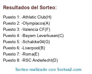 Lista de participantes: -Olympiacos(A), -Liverpool(B), -Bayern Leverkusen(C), -RSC Anderlecht(D), -Roma(E), -Valencia CF(F), -Schalcke04(G), -Athletic Club(H).