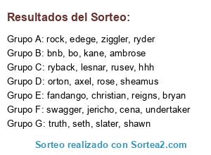 Lista de participantes: rose, bnb, bo, lesnar, jericho, christian, axel, bryan, ambrose, ziggler, edege, fandango, slater, swagger, cena, kane, truth, orton, rock, reigns, rusev, ryback, seth, shawn, sheamus, hhh, undertaker, ryder.