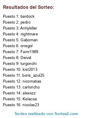 Lista de participantes: kist2013, nicolas23 , Famr1989, boris_azul25, orregol, Gaboman, Kelacoa, Deivid, Anhykiller, bardock, turgonchi, alexxzz, pedro, nightmare, carloncho, nicomatias.