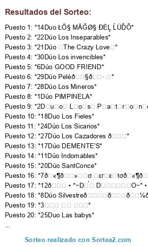 Lista de participantes: *1Dúo PIMPINELA*, *2D͎u͎o͎ L͎o͎s͎ P͎a͎t͎r͎o͎n͎e͎s͎*, *3ꀷꀎꂦ ꀷꏂ ꂦꋪꂦ*, *4Dúo Malaya*, *5Dúo 🔥DINÁMITA🔥*, *6Dúo GOOD FRIEND*, *7🫶🏻ɖนσ ℘εгʄεɕtσ🫶🏻*, *8Dúo Silvestre🕊️🙏🏼🛐*, *9❦︎𝕾𝖔𝖚𝖑𝕸𝖆𝖙𝖊 𝕴𝖓 𝕷𝖚𝖉𝖔❦︎*, *10Dúo LA HERMANDAD*, *11Dúo Indomables*, *12💙 • *~Dᴜ́ᴏ DɪɴᴀᴍɪᴄO~* • ♥️, *13Dúo ALFA Y OMEGA*, *14Duo ŁŌ§ MĀĞØ§ ĐĖĻ ĹÜĎÕ*, *15Dúo TH£ B@nd!døs*, *16Dúo Los Mata Seba*, *17Dúo DEMENTE'S*, *18Duo Los Fieles*, *19Dúo DesTruxTores*, *20Dúo SantConce*, *21Dúo ✰The Crazy Love✰*, *22Dúo Los Inseparables*, *23Dúo The Crazy Artist*, *24Dúo Los Sicarios*, *25Duo Las babys*, *26۞𝔻𝕦𝕠 𝕃𝕒𝕤 𝕃𝕖𝕪𝕖𝕟𝕕𝕒𝕤۞*, *27Dúo Los Cazadores 😎*, *28Dúo Los Mineros*, *29Dúo Pelé🇧🇷 ⚽*, *30Dúo Los invencibles*, *31✜Dúo Las Sin 6✜*, *32Dúo Evolution*.