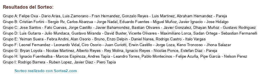 Lista de participantes: Rodrigo Barrera - Ruben Lopez, Gustavo Miranda - David Buster, Eduardo Fuentes - Miguel Muñoz, Vicente Olivares - Maximiliano Lorca, Luis Zamorano - Fran Hernandez, Andres Tapia - Leandro Torres, Pablo Montecinos - Felipe Acuña, Yeiman Suera - Febra Andini, Erwin Castillo - Jorge Loza, Sadan Ortega - Sebastian Fermanelli, Ignacio Fuentealba - Marcos Espinoza, Luis Gutarra - Julio Mundaca, Gonzalo Reyes - Luis Martinez, Felipe Oxa - Dario Arias, Jose Santos - Fato Cuevas, Bryan Loyola - Nicolas Martinez, Jorge Castillo - Javier Bahamondez, Leonel Fernandez - Leonardo Vidal, Ciro Osorio - Juan Curiotti, Cristian Fortini - Sergio Rv, Rodrigo Castro - Italo Vargas, Carlos Abarzua - Jorge Nadal, Abraham Hernandez - Pareja, Enzo Delpin - Daniel Narea, Javier Ignacio - Jose Hidalgo, Ignacio Reyes - Nicolas Ponce, Alberto Reyes - Rey Molina, Estefan Diaz - Pareja, Keno Troncoso - Jhona Salazar, Dhayan Muñoz - Gustavo Rodriguez, Bastian Olivares - Javier Gonzalez, Pipe Garcia - Nelson Perez, Alan Osorio - Bruno, Javier Diaz - Piero Tapia.