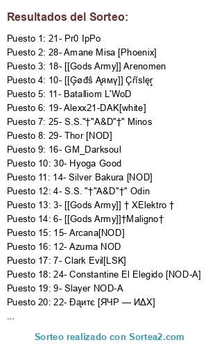 Lista de participantes: 1- [Pr0]Killer-[EligoR], 2- -PrO- Kiryu, 3- [[Gods Army]] † XElektro †, 4- S.S. "†"A&D"†" Odin, 5- Pr0 Chazz_666, 6- [[Gods Army]]†Maligno†, 7- Clark Evil[LSK], 8- RizThO18[C-gm], 9- Slayer NOD-A, 10- [[Ģøđŝ Ąямγ]] Çŕĭslęŗ, 11- Batalliom L'WoD, 12- Azuma NOD, 13- Avenger Siegfried Gods Army, 14- Silver Bakura [NOD], 15- Arcana[NOD], 16- GM_Darksoul, 17- [[Gods Army]] llREIVEN, 18- [[Gods Army]] Arenomen, 19- Alexx21-DAK[white], 20- RAMPAGE TP, 21- Pr0 IpPo, 22- Ðąиτє [ЯЧP — ИΔX], 23- Donaslord [NOD], 24- Constantine El Elegido [NOD-A], 25- S.S."†"A&D"†" Minos, 26- El BaRtO[SVyM], 27- Kronic[Pr0], 28- Amane Misa [Phoenix], 29- Thor [NOD], 30- Hyoga Good.