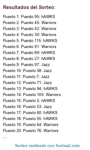 Lista de participantes: Puesto 1: Jazz, Puesto 2: hAWKS, Puesto 3: Warriors, Puesto 4: Warriors, Puesto 5: hAWKS, Puesto 6: Warriors, Puesto 7: Jazz, Puesto 8: Warriors, Puesto 9: Warriors, Puesto 10: Warriors, Puesto 11: Warriors, Puesto 12: Warriors, Puesto 13: Warriors, Puesto 14: Warriors, Puesto 15: hAWKS, Puesto 16: Warriors, Puesto 17: Warriors, Puesto 18: hAWKS, Puesto 19: Warriors, Puesto 20: Jazz, Puesto 21: hAWKS, Puesto 22: Warriors, Puesto 23: Warriors, Puesto 24: hAWKS, Puesto 25: Warriors, Puesto 26: Warriors, Puesto 27: hAWKS, Puesto 28: hAWKS, Puesto 29: Warriors, Puesto 30: Warriors, Puesto 31: Jazz, Puesto 32: hAWKS, Puesto 33: hAWKS, Puesto 34: hAWKS, Puesto 35: Warriors, Puesto 36: Warriors, Puesto 37: Warriors, Puesto 38: Warriors, Puesto 39: Warriors, Puesto 40: Warriors, Puesto 41: hAWKS, Puesto 42: Warriors, Puesto 43: Warriors, Puesto 44: hAWKS, Puesto 45: Warriors, Puesto 46: hAWKS, Puesto 47: Warriors, Puesto 48: Warriors, Puesto 49: Warriors, Puesto 50: Warriors, Puesto 51: Jazz, Puesto 52: hAWKS, Puesto 53: Jazz, Puesto 54: Warriors, Puesto 55: hAWKS, Puesto 56: hAWKS, Puesto 57: Jazz, Puesto 58: Jazz, Puesto 59: Warriors, Puesto 60: hAWKS, Puesto 61: hAWKS, Puesto 62: hAWKS, Puesto 63: Warriors, Puesto 64: Warriors, Puesto 65: Warriors, Puesto 66: hAWKS, Puesto 67: Warriors, Puesto 68: Jazz, Puesto 69: Jazz, Puesto 70: Jazz, Puesto 71: Jazz, Puesto 72: Warriors, Puesto 73: Warriors, Puesto 74: hAWKS, Puesto 75: hAWKS, Puesto 76: Warriors, Puesto 77: hAWKS, Puesto 78: hAWKS, Puesto 79: Warriors, Puesto 80: hAWKS, Puesto 81: Warriors, Puesto 82: hAWKS, Puesto 83: Warriors, Puesto 84: Jazz, Puesto 85: Jazz, Puesto 86: Warriors, Puesto 87: Jazz, Puesto 88: Jazz, Puesto 89: hAWKS, Puesto 90: Warriors, Puesto 91: Warriors, Puesto 92: hAWKS, Puesto 93: hAWKS, Puesto 94: hAWKS, Puesto 95: hAWKS, Puesto 96: hAWKS, Puesto 97: Jazz, Puesto 98: hAWKS, Puesto 99: Warriors, Puesto 100: Warriors, Puesto 101: Warriors, Puesto 102: Warriors, Puesto 103: Jazz, Puesto 104: Warriors, Puesto 105: Warriors, Puesto 106: Warriors, Puesto 107: Warriors, Puesto 108: Warriors, Puesto 109: Jazz, Puesto 110: Warriors, Puesto 111: hAWKS, Puesto 112: Jazz, Puesto 113: Warriors, Puesto 114: hAWKS, Puesto 115: hAWKS, Puesto 116: Warriors, Puesto 117: Warriors, Puesto 118: Warriors.