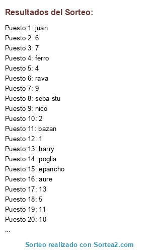 Lista de participantes: epancho, rava, ferro, nico, harry, yeral, yapu, lape, poglia, aure, seba stu, bazan, axel, alvaro, juan, 1, 2, 3, 4, 5, 6, 7, 8, 9, 10, 11, 12, 13.