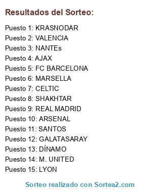 Lista de participantes: SANTOS, VALENCIA, AJAX, NANTEs, CELTIC, ARSENAL, FC BARCELONA, REAL MADRID, KRASNODAR, SHAKHTAR, DÍNAMO, LYON, M. UNITED, MARSELLA, GALATASARAY.