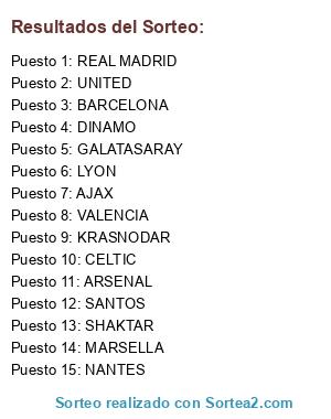 Lista de participantes: LYON, SHAKTAR, BARCELONA, GALATASARAY, KRASNODAR, NANTES, REAL MADRID, DINAMO, ARSENAL, CELTIC, UNITED, VALENCIA, AJAX, SANTOS, MARSELLA.