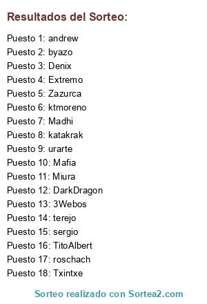 Lista de participantes: DarkDragon, Extremo, Zazurca, Denix, katakrak, ktmoreno, 3Webos, Miura, sergio, Mafia, andrew, terejo, urarte, Madhi, Txintxe, TitoAlbert, roschach, byazo.