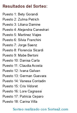 Lista de participantes: Bety Gorandi, German Guevara, Zulma Petrich, Silvia Franchini, Danisa Carla, Florencia Sicardi, Alejandra Canestrari, Cris Vidoret, Carina Villa, Vanesa Contadin, Patricia Ceparo, Claudia Acosta, Martinez Viajes, Jorge Saenz, Liliana Damine, Ivana Galvan, Lore Cagnassi, Mabe Bertoni.