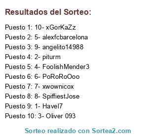 Lista de participantes: 1- Havel7, 2- piturm, 3- Oliver 093, 4- FoolishMender3, 5- alexfcbarcelona, 6- PoRoRoOoo, 7- xwownicox, 8- SpiffiestJose, 9- angelito14988, 10- xGorKaZz.