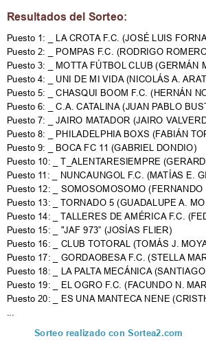 Lista de participantes: _ T_ALENTARESIEMPRE (GERARDO MONTICH), _ TORNADO UNO (HERNÁN MONTANI), _ LOS POETAS F.C. (JAVIER I. GUASTINI), _ FREY CLUB F.C. (JOSÉ FREYTE), _ LA CROTA F.C. (JOSÉ LUIS FORNACIARI), _ SOMOSOMOSOMO (FERNANDO SOTTANO), _ LAS ESPERANZAS DE LULA (LUCAS S. ORTÍZ), _ AGACHÁTE QUE VIENEN LOS INDIOS (MARÍA JENNIFER MEDINA), _ UNI DE MI VIDA (NICOLÁS A. ARATA), _ ARANDINA (NÉLSON REZZÓNICO), _ CLUB TOTORAL (TOMÁS J. MOYANO), _ GORGOJO FÚTBOL CLUB (ALBERTO CASAMAYOR), _ ANTÍLOPES 07 (GUILLERMO BESSONE), _ BOCA FC 11 (GABRIEL DONDIO), _ EL EQUIPO PAPÁ (LUIS A. CASAMAYOR CEBALLOS), _ MAXI AC (MAXIMILIANO CORRADI), _ MOTTA FÚTBOL CLUB (GERMÁN M. DURÁN), _ DEPORTIVO ALL IN (DARÍO DELGADO), _ C.A. CATALINA (JUAN PABLO BUSTAMANTE), _ POMPAS F.C. (RODRIGO ROMERO), _ DEFENSORES DE EDMEI (NICOLÁS ORTÍZ), _ CENCOR F.C. (LUIS I. KAPLAN), _ ALASSIA F.C. (ANDRÉS G. ALASSIA), _ MESA CHICA F.C. (OSVALDO TORRES), _ POETASDELCÉSPED (LUCIANO LAVEZZARI), _ FARSA F.C. (MIGUEL RAFAEL), _ GLORIOSO COR AR (JUAN S. PEDERNERA), _ PHILADELPHIA BOXS (FABIÁN TORRES), _ NUNCAUNGOL F.C. (MATÍAS E. GIUSTI), _ ARQUITÉ BIGDT (JAVIER MOYANO), _ POCA COCA JRS. (GONZALO A. CÁRDENAS), _ LA PALTA MECÁNICA (SANTIAGO VILLARRUEL), _ CAVISACATE (DIÓGENES MOYANO), _ ATOMIC ANT (MELINA BADUY), _ MÁNCHESTER SUIITY (PABLO A. SABEH), _ VARICOCELE F.C. (JUAN PABLO PUSTERLA), _ DÍNAMO FA (MARCELO MELLANO), _ ESCUELA RAÚL (RAÚL CASAMAYOR), _ LORENZO RF (EMANUEL TUBELLO), _ NO N@ME (CLAUDIA E. PEREYRA), _ SERENOS DE ONGAMIRA F.C. (SERGIO G. TOBANELLI), _ LOS GRIEGOS (FRANCO VILLAGRA), _ LOCADEMIA CORDOBESA (CHRISTIAN REZZÓNICO), _ LOS POROTITOS GLORIOSOS (INGRID R. HEREDIA), _ LOS MELLIS DE LA ACADE (JUAN PABLO REZZÓNICO), _ CARA 21 (ARIEL AMAYA), _ NOVOTIN (SEBASTIÁN MONTI), _ "JAF 973” (JOSÍAS FLIER), _ CHASQUI BOOM F.C. (HERNÁN NOVILLO), _ ES UNA MANTECA NENE (CRISTHIAN CAMINOS), _ BOSTEROS CORDOBESES (ANTONIO M. ALLENDE), _ TALLERES DE AMÉRICA F.C. (FEDERICO J. VILLEGAS), _ ARQUITE (LUCAS GROENDIJK), _ 5 AL FONDO (HÉCTOR E. GANIM), _ EL OGRO F.C. (FACUNDO N. MARTINI), _ TORNADO 5 (GUADALUPE A. MONTANI), _ I LA MARTINA (MARCOS D. NORIEGA), _ LOS FUNEBREROS DEL SARMIENTO (PABLO N. GUTIÉRREZ), _ MESA GRANDE F.C. (MARÍA MIRTA YUDOWICZ), _ JAIRO MATADOR (JAIRO VALVERDE), _ C.A. WILLIAMS KEMMIS (MARIANO C. FLORES), _ GORDAOBESA F.C. (STELLA MARIS GONZÁLEZ), _ VIEJITA KENOSABE F.C. (CARLOS JULIO MOYANO), _ RUSTIQUIEMOS FÚTBOL AMATEUR (NICOLÁS GUERRINI).