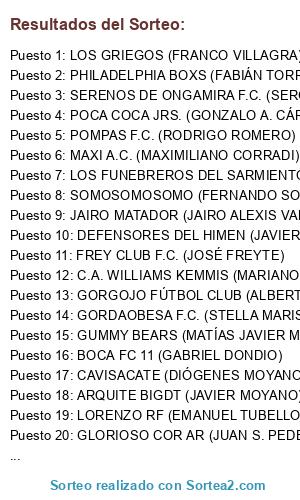Lista de participantes: 5 AL FONDO (HÉCTOR EDUARDO GANIM), ALASSIA F.C. (ANDRÉS GABRIEL ALASSIA), ANTILOPES07 (GUILLERMO BESSONE), ARANDINA (NÉLSON REZZÓNICO), ARQUITE (LUCAS GROENDIJK), ARQUITE BIGDT (JAVIER MOYANO), BOCA FC 11 (GABRIEL DONDIO), C.A. CATALINA (JUAN PABLO BUSTAMANTE), C.A. WILLIAMS KEMMIS (MARIANO CARLOS FLORES), C.A.S.L. (CBA) (EZEQUIEL BASUALDO), CABJ (EMANUEL CORTEZ), CARA 21 (ARIEL AMAYA), CAVISACATE (DIÓGENES MOYANO), CENCOR F.C. (LUIS KAPLAN), CLUB TOTORAL (TOMÁS J. MOYANO), DEFENSORES DE EDMEI (NICOLÁS E. ORTÍZ), DEFENSORES DEL HIMEN (JAVIER C. CORNELIS), DEPORTIVO ALL IN (DARÍO DELGADO), DÍNAMO FA (MARCELO MELLANO), EL EQUIPO PAPÁ (LUIS A. CASAMAYOR CEBALLOS), EL OGRO F.C. (FACUNDO NICOLÁS MARTINI), ES UNA MANTECA NENE (CRISTHIAN CAMINOS), ESCUELA RAÚL (RAÚL CASAMAYOR), FARSA F.C. (MIGUEL RAFAEL), FREY CLUB F.C. (JOSÉ FREYTE), GLORIOSO COR AR (JUAN S. PEDERNERA), GORDAOBESA F.C. (STELLA MARIS GONZÁLEZ), GORGOJO FÚTBOL CLUB (ALBERTO CASAMAYOR), GUMMY BEARS (MATÍAS JAVIER MARTINI), I LA MARTINA (MARCOS D. NORIEGA), JAF 973 (JOSÍAS FLIER), JAIRO MATADOR (JAIRO ALEXIS VALVERDE), LA CROTA F.C. (JOSÉ LUIS FORNACIARI), LA KLOPPONETA (IGNACIO SASTRE), LA PALTA MECÁNICA (SANTIAGO VILLARRUEL), LAS ESPERANZAS DE LULA (LUCAS S. ORTÍZ), LOCADEMIA CORDOBESA (CHRISTIAN REZZÓNICO), LORENZO RF (EMANUEL TUBELLO), LOS FUNEBREROS DEL SARMIENTO (PABLO N. GUTIÉRREZ), LOS GRIEGOS (FRANCO VILLAGRA), LOS MELLIS DE LA ACADE (JUAN PABLO REZZÓNICO), LOS POETAS F.C. (JAVIER I. GUASTINI), LOS POROTITOS GLORIOSOS (INGRID R. HEREDIA), MÁNCHESTER SUIITY (PABLO A. SABEH), MAXI A.C. (MAXIMILIANO CORRADI), MESA CHICA F.C. (OSVALDO TORRES), MESA GRANDE F.C. (MARÍA MIRTA YUDOWICZ), MOTTA FÚTBOL CLUB (GERMÁN M. DURÁN ROMERO), NO N@ME (CLAUDIA E. PEREYRA), NOVOTIN (SEBASTIÁN MONTI), NUNCAUNGOL F.C. (MATÍAS E. GIUSTI), PHILADELPHIA BOXS (FABIÁN TORRES), POCA COCA JRS. (GONZALO A. CÁRDENAS), POETASDELCESPED (LUCIANO LAVEZZARI), POMPAS F.C. (RODRIGO ROMERO), SERENOS DE ONGAMIRA F.C. (SERGIO G. TOBANELLI), SOMOSOMOSOMO (FERNANDO SOTTANO), T_ALENTARESIEMPRE (GERARDO MONTICH), TALLERES DE AMÉRICA F.C. (FEDERICO JAVIER VILLEGAS), TOCA Y PASA POR ATRÁS (JOSÉ IGNACIO VILLARRUEL), TORNADO 5 (GUADALUPE A. MONTANI M.), TORNADO UNO (HERNÁN MONTANI), UNI DE MI VIDA (NICOLÁS A. ARATA), VARICOCELE F.C. (JUAN PABLO PUSTERLA).