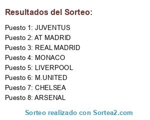Lista de participantes: ARSENAL, AT MADRID, LIVERPOOL, REAL MADRID, M.UNITED, CHELSEA, JUVENTUS, MONACO.