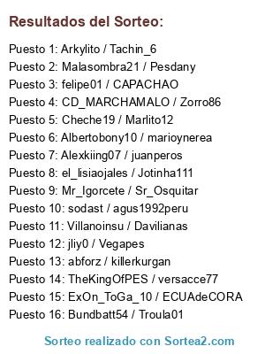 Lista de participantes: Bundbatt54 / Troula01, felipe01 / CAPACHAO, CD_MARCHAMALO / Zorro86, ExOn_ToGa_10 / ECUAdeCORA, Mr_Igorcete / Sr_Osquitar, el_lisiaojales / Jotinha111, Arkylito / Tachin_6, Alexkiing07 / juanperos, Albertobony10 / marioynerea, abforz / killerkurgan, jliy0 / Vegapes, sodast / agus1992peru, Cheche19 / Marlito12, Malasombra21 / Pesdany, Villanoinsu / Davilianas, TheKingOfPES / versacce77.