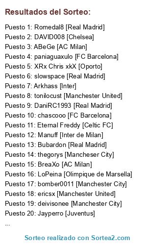 Lista de participantes: anGeel15 [Standard de Lieja], Jayperro [Juventus], chascooo [FC Barcelona], rasokin1 [Manchester City], ABeGe [AC Milan], deivisonee [Manchester City], paniaguaxulo [FC Barcelona], Vivastalavera [Real Madrid], thegorys [Mancheser City], Romedal8 [Real Madrid], LoPeina [Olimpique de Marsella], bomber0011 [Manchester City], Bubardon [Real Madrid], DAVID008 [Chelsea], DaniRC1993 [Real Madrid], BreaXo [AC Milan], slowspace [Real Madrid], XRx Chris xkX [Oporto], MrIb0r063 [Real Madrid], Manuff [Inter de Milan], Eternal Freddy [Celtic FC], ericsx [Manchester United], tonilocust [Manchester United], Arkhass [Inter].