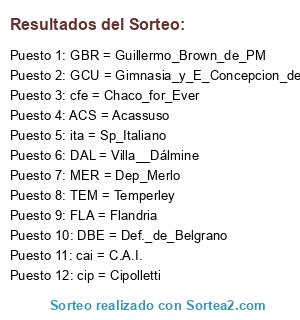 Lista de participantes: GCU = Gimnasia_y_E_Concepcion_del_Uruguay, DAL = Villa__Dálmine, DBE = Def._de_Belgrano, GBR = Guillermo_Brown_de_PM, cfe = Chaco_for_Ever, cip = Cipolletti, cai = C.A.I., ita = Sp_Italiano, TEM = Temperley, MER = Dep_Merlo, FLA = Flandria, ACS = Acassuso.