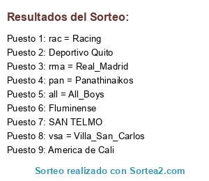 Lista de participantes: est = Estudiantes_LP, rac = Racing, riv = River, lan = Lanus, bel = Belgrano, col = Colon, def = Defensa_y_Justicia, ars = Arsenal, ban = Banfield, boc = Boca, arg = Argentinos_jrs, gim = Gimnasia_LP, gyj = Gimnasia_de_Jujuy, tig = Tigre, ind = Independiente, int = Instituto, pat = Patronato, san = San_Lorenzo, uni = Union_de_Santa_Fe, vel = Velez, all = All_Boys, alm = Almirante_Brown, atl = Atletico_Tucuman, ald = Aldosivi, bou = Boca_Unidos, cen = Rosario_Central, inr = Independiente_Rivadavia, itu = Ituzaingo, mer = Deportivo_Merlo, new = Newells, god = Godoy_Cruz, hur = Huracan, dha = Douglas_Haig, vsa = Villa_San_Carlos, tem = Temperley, tir = Tiro_Federal, qui = Quilmes, sar = Sarmiento_de_Junin, cha = Chacarita, fer = Ferro, acm = AC_Milan, ben = Benfica_FC, bfc = Barcelona_FC, bay = Bayern_Munich, mac = Manchester_City, nap = Napoli, oll = Olympique_Lyonnais, pan = Panathinaikos, psg = París_Saint_Germain, por = Porto_FC, rma = Real_Madrid, wbr = Werder_Bremen, arl = Arsenal_Inglaterra, bor = Borussia_Dortmund, che = Chelsea, csk = CSKA_Moscow, imi = Inter_Milan, juv = Juventus, liv = Liverpool, mau = Manchester_United, val = Valencia, gal = Galatasaray, atm = Atletico_Madrid, aja = Ajax, AHL = AL_AHLY, AIN = AL_AIN, ULS = ULSAN_HYUNDAI, SHA = SHANGAI_SHENHUA, FRE = SAN_FRECCE, ESP = ESPERANCE_SPORTIVE, CAS = WYDAD_CASABLANCA, BRI = BRISBANE_ROAR, America de Cali, Atl. Mineiro, Botafogo, Colo Colo, Cruzeiro, Tolima, Deportivo Quito, Flamengo, Fluminense, Gremio, Internacional de PA, Nacional Montevideo, Olimpia, Once Caldas, Palmeiras, Peñarol, Pumas UNAM, Santos, Sao Paulo, Vasco da Gama, Alianza Lima, America Mexico, Nacional Medellin, Barcelona Ecuador, Bolivar, Cerro Porteño, Corinthians, Cruz Azul, Danubio, Dep.Tachira, Juan Aurich, Libertad Paraguay, Liga de Quito, LA Galaxy, Monterrey, NY Red Bulls, SO Cristal, U Catolica, U de Chile, Universitario de Lima, DOCK SUD, TALLERES, SAN TELMO, OLIMPO, ALVARADO, BROWN ADROGUE, SAN MARTIN SAN JUAN, ATLANTA, SAN MARTIN TUCUMAN, CAI, ESTUDIANTES BS AS, SP BELGRANO, CRUCERO DEL NORTE, MANDIYU, DEP ESPAÑOL, ATL RAFAELA, SARMIENTO RESISTENCIA, GUARANI AF, CHICAGO, PLATENSE.
