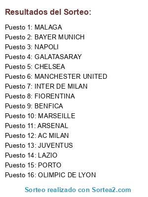 Lista de participantes: BAYER MUNICH, BENFICA, JUVENTUS, AC MILAN, CHELSEA, MANCHESTER UNITED, OLIMPIC DE LYON, MARSEILLE, MALAGA, NAPOLI, ARSENAL, FIORENTINA, INTER DE MILAN, LAZIO, PORTO, GALATASARAY.