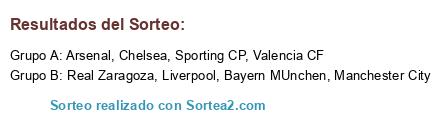 Lista de participantes: Arsenal, Chelsea, Liverpool, Bayern MUnchen, Valencia CF, Real Zaragoza, Manchester City, Sporting CP.