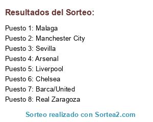 Lista de participantes: Arsenal, Malaga, Chelsea, Sevilla, Barca/United, Real Zaragoza, Liverpool, Manchester City.
