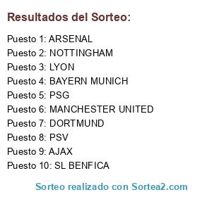 Lista de participantes: ARSENAL, MANCHESTER UNITED, PSV, DORTMUND, SL BENFICA, NOTTINGHAM, PSG, AJAX, LYON, BAYERN MUNICH, ATLETICO DE MADRID, WIN.