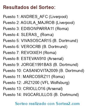 Lista de participantes: AGUILA_MAJROB (Liverpool), ANDRES_AFC (Liverpool), CASANOVITA2009 (B. Dortmund), CRIOLLO16 (Arsenal), EDISONPARRA11 (Roma), ESTEVAN910 (Arsenal), INGCARLILLOS (B. Dortmund), JORGE1991BAS (B. Dortmund), JRZ1200 (VFL Wolfsburg), MARCOSRZ11 (Roma), REVOIXEH (Roma), SLERAS_ (Roma), VEROCRB (B. Dortmund), VIVASOSCAR15 (B. Dortmund).