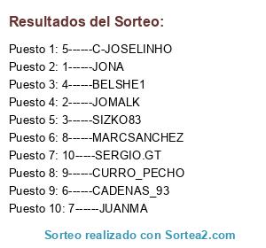 Lista de participantes: 1------JONA, 2------JOMALK, 3------SIZKO83, 4------BELSHE1, 5------C-JOSELINHO, 6------CADENAS_93, 7------JUANMA, 8------MARCSANCHEZ, 9------CURRO_PECHO, 10-----SERGIO.GT.
