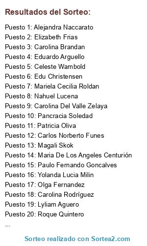 Lista de participantes: Abraham Brandt, Adriana Rios, Adry Rojo, Agus Solis, Agustina Garcia, Alan Navarro, Alejandra Galarza, Alejandra Giardino, Alejandra Naccarato, Alejandra Nogales de Farfal, Alejandra Pintos, Alexander Blanco, Alicia Elsa Garrote, Amelia Artiaga, Amelia Soler, Ana Cecilia Lencina Flores, Ana Chavz, Ana Maria Jimenez, Analia Rodriguez, Analia Rubio, Analia Sanchez, Analia Streda, Analis Salazar, Andre Brane, Andrea Eugenia, Andrea Martin, Andrea Ortiz, Angel Mojalote, Angelica Couso, Anita Rodriguez, Antonella Tejerina, Avalos Malena, Barbi Gimenez, Belén Roddriguez, Benjamin Vallejo, Betina Fernandez, Bettiana Villalba, Bibiana Paris, Cami Avalos, Carlos Norberto Funes, Carmen de Algarbe, Carmen Molina, Carolina Brandan, Carolina Casarini, Carolina Del Valle Zelaya, Carolina Garcia, Carolina Gastiazoro, Carolina Rodríguez, Cecilia Esteban, Celeste Andrea Piris, Celeste Muiño, Celeste Wambold, Chaela Ayala, Charly Barcelo, Claudia Adriana Santillan, Claudia da Silva, Claudia Marcela, Claudia Norma Piris, Criss Correa, Cristian Lyardet, Cristina Benitez, Cristina Del Valle Santillan, Cristina Lencina, Cynthia Tamara Agüero Luna, Daniel Abraham, Daniel Bértolo, Daniel Fiorito, Daniel J. Peña, Daniel Matta, Daniela Ariadna, Daniela Perez Serratore, Daniela Roman, Debora Natalia Rios, Dian Elena, Diana Muñoz, Diego Martin, Diego Naveira, Dolores Zurita, Edu Christensen, Eduardo Arguello, Eliana Tombolan, Elias Ezequiel, Elisabeth Diaz, Elizabeth Frias, Elizabeth Margarittini, Elsa Beatriz Ortelli, Ely Elyza de Nyrka, Emilia Gallo, Emilia Suarez, Emilse Alderetes, Erika Fernandez, Estela Aguero, Estela Catalina Caza, Estela Liza, Estela Rivas, Ester Morales, Esther Chechu, Euge Varela, Eugenia Farach, Evangelina Pessolani, Fabiana Moras, Favian Reynoso, Federico Gonzalez, Felipe Oscar Montivero, Fernii Fabro, Florencia D'Alessandro, Franco Orlovas, Gabiih Canuto, Gabiiz Dante, Gaby Mirabile, Gladys Rodriguez, Gloria Salado, Graciela Aybar, Graciela Dipasquale, Graciela Noe, Graciela Pereyra, Graciela Toledo, Griselda Cascallares, Guadalupe Vega, Gustavo Collada, Gustavo Rios, Gustavo Sotelo, Hernán Alonso, Horacio Velenzuela, Ignacio Filsinger, Ingrid Jubells, Irma Noemi Silva, Isabel Cardozo, Ivanna Skok, Jaus Stella Maris Buselli, Javier Gonzalez, Jesica Latessa, Johanna Garrido, Jorge Vañatto, JorgeyMariana Villarreal, José Torres, Juan Bautista Gonzalez, Juan Carlos Ibañez, Juan Luraschi, Julieta Laura Crespi, Julio Gauna, Julio Roberto Peña, Karina Lucia Rodriguez, Karina Mareco, Karo Aya, Karu Torres, Kika Parache, Laa Maaquuzz, Laa Monii, Lali Estrella, Lara Herrera, Laueli Fiszman, Laura Flor, Laura Jimenez, Laura la Morocha, Laura Valeria Cantaluppi, Leon De Jesus Gomez, Leyes Edit Mirta, Lidia Vazque, Lili Godani, Lili Maldonado, Liliana Casajemas, Liliana Olea, Lola Gimenez, Lola Val Borelli, Lorena Daniela Garbovetsky, Luan Castro, Lucia Gonzalez, Lucia Moyano, Luciano Morresi, Luis Bertran, Luis Leonardo, Luis Soto, Lukas Aldana, Luquitas Ruiz, Lyliam Aguero, Maarcee Silvi Silva, Magali Skok, Marcela Coronel, Marcela Miguez, Marcelino Kargul, Marcelo Tieri, Maria Antonia Altamira, María Daniela Blanco, Maria De Los Angeles Centurión, Maria Del Carmen Ceballos, Maria Ester Bustamante, Maria Eugenia Estivill, Maria Jimena, Maria Jose Flores, Maria Lo Brutto, Maria Luraschi, Maria Rosa Caballero, Mariana Cabrera, Mariana Suazo, Mariangel Molina, Mariano Perez, Maricel Veronica Saez, Mariela Cecilia Roldan, Mariela Lazarte, Mariela Soledad Borrajo, Mariela Ybarra, Mariita Soto, Marina Donnari, Mario Alfredo Ibarra, Mario Hector, Marisa Jerassi, Marisa Nuñez, Marta Achares, Marta Susana Ossan, Martín De Los Santos, Martin Maroto, Martín Veras, Mellis Pintos, Mercedes Quiroga, Mica Poblete, Miguel Carrizo, Miguel Diaz, Miriam Soto, Mirta Andreu, Mirta Cardozo, Mirta Gramajo, Mirta Iturra, Mirta Prysunka, Mirta Shott, Monica Barreto, Monica Madariaga, Monica Tabarcache, Monii Base, Morena Rodriguez, Nadia Vero Nica, Nahuel Lucena, Natalia Leiva, Nelyda Valdez, Noemi Cauda, Nora Gomez Alvarez, Norma Lencina, Norma Lovato, Norma Masferrer, Olga Fernandez, Oscar Alberto Naveira, Osvaldo Carrizo, Osvaldo Ismael Barrios, Pablo Barbaglia, Pablo Cabrera, Pablo Romero, Pancracia Soledad, Paola Avila, Paola Boarini, Patricia Medina, Patricia Oliva, Paulino Hernández, Paulo Fernando Goncalves, Pedro Ramon Herrera, Ramon Lorasque, Raul Kellenbach, Raul Quintana, Ricardo Tisera, Rita Lopez, Rocío Manchón, Romina Natalia Guzzi, Roque Quintero, Rosa Belazque, Rosa Gerez, Rosalia Beatriz Matto, Rosana Lorena Cornaglia, Rosario Belen Castellano, Roxana Vargas, Ruben Fonseca, Ruben Jorge Salazar, Ruth Azcarate, Ruth Vera, Sabrina Cortes, Sandra Bernal, Sandra Carabajal, Sandra Elizabeth Sosa, Sara Mabel Jimenez, Seba Escalante, Silvana Rojas Kahn, Silvi Garcia, Silvia Molina, Silvia Ruiiz, Silvia Russ, Silvia Salas, Silvia Tanel, Silvina Claudia Rodrigo, Silvina Pérez, Silvio Gaby Leguiza, Soff Testorelli, Sofia Modragon, Sofia Puchalski, Sol Luna Rossetto, Sole Sosa, Soledad Santomauro, Sonia Benitez, Sonia Elizabeth, Stella Bentancor, Susana Gamba, Susana Llanes, Susana Vera, Teté Vega, Tincho Ric, Tita Ibarra, Vale Bonsignori, Valentina Cordoba, Vanina Jimenez, Vero Vero Morales, Verónica Taibo, Verónica Valdez Alderetes, Vicky Espinoza, Victoria Collado Ferrari, Villalva Ferreyra Beatriz Moni, Vir Ponce, Viviana Dobber, Viviana Lescano, Viviana Millalonco, Viviana Pizzorno, Viviana Sandra Naya, Yamila Braviz Paredes, Yanina Saucedo, Yany Marcello, Yolanda Lucia Milin, Zulema Miranda.
