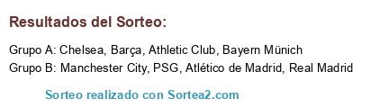 Lista de participantes: Atlético de Madrid, Real Madrid, Barça, Chelsea, Athletic Club, Manchester City, Bayern Münich, PSG.
