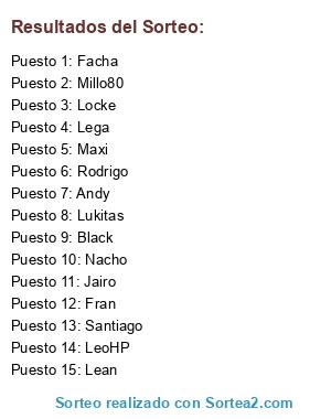 Lista de participantes: Andy, Black, Facha, Fran, Jairo, Lean, Lega, LeoHP, Locke, Lukitas, Nacho, Maxi, Rodrigo, Santiago, Millo80.