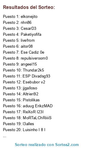 Lista de participantes: Esebubor v2, kishin dez 720, elkonejito, Isinho88, MoRTaLChRiiiiS, Lolo497, AbeeceedariO v2, lNeeji 90l, jjgalloso, Cazorla l 20 l, Pistolikas, Pepepo94, Paketiyofifa, Dani x360x, DeViL xWaLyGaRx, livefrom, XxMartinezxX, aitor08, Xx JoSe 7 xX, Hernan20, l3alles, x ZaVeL x, torres1992, Juanjerez, josemolon95, ESP Divadsg93, angeel15, Leonevil, Batiguaje, pedritomol, CesarD3, IntiPodesta, djtronchi, repulsiveroom0, FerXu21, cazador67, Ronoa kikke 360, SOLIDUSBOSS, C0KEEE, ReXoR I23I, xGorKaZz, Thundar2k5, torrija, ronaldo59992, d4vid23, Danzare, Quaresma l 10 l, Ruben ESP 89, jozeddie, Vitalsilver18, Capo Canoneri, GoriD13, Ese Cadiz 0e, Altrieri92, xX CuKo Xx, Taxmanbcn, Tukuma tu mai, EL JOKER I9I, IL MURO, aduug ErikzMAD, nhn86, Josugraf94, Luisinho I 8 I, Mr Trasgu.