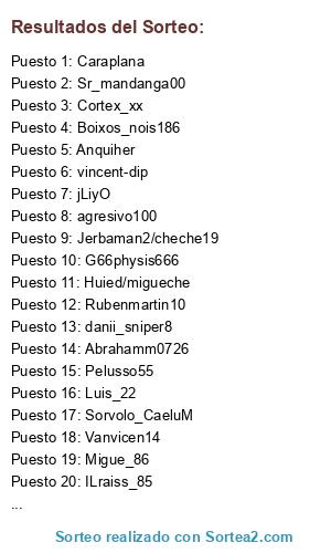 Lista de participantes: Miguel_ruano, Migue_86, Sorvolo_CaeluM, Sheriffchenko / kero101010, Huied/migueche, Caraplana, Miguecs93_CaeluM, Lakylu, ALE87_ITA, predator19-, Twisterswar/angelete_7, Baricelli, RubensFCB, Cases_89, Fer_Don3p, antonioperezSFC, Abrahamm0726, tachin_6, Rafuka_666, Something, G66physis666, Anquiher, Soccatala73, Vidalsergi, Pes_lolito, Kamisama_1095, mateocamisa10, Pelusso55, Vanvicen14, Rubenmartin10, Jorgelm_CaeluM, Soto___11, Jerbaman2/cheche19, VAMOS_VINCENT, RiWiVi, Selinichev, Pacoeste, F4r4On 1988, fantástico-1 "jose", Hackapell_, LimbergAVM, vincent-dip, danii_sniper8, agustainer, Juanma641990, agresivo100, Cortex_xx, Boixos_nois186, Alberkin, Cipotti, Pablogar06, ILraiss_85, intocable 1986, juan_angel10, Luis_22, enrimabe07, jerasxs, Comohuelo, Sr_mandanga00, promures_joaquin, jLiyO, amortee, PESD10S, ADuMat_6.