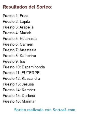Lista de participantes: Espaminonda, Isis , Marimar, Kamber, Kassandra, Katherina, Arabella, Mariah, Frida, Carmen, Anastasia, Darlene , Eutanasia, EUTERPE., Lupita, Jesusa.