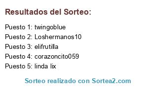 Lista de participantes: twingoblue, Loshermanos10, gua guau, corazoncito059, linda lix, Rochi2435, elifrutilla.