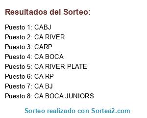 Lista de participantes: CA RIVER, CABJ, CARP, CA BOCA, CA RP, CA BJ, CA RIVER PLATE, CA BOCA JUNIORS.