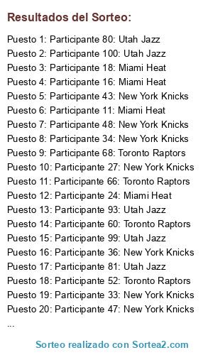 Lista de participantes: Participante 1: Miami Heat, Participante 2: Miami Heat, Participante 3: Miami Heat, Participante 4: Miami Heat, Participante 5: Miami Heat, Participante 6: Miami Heat, Participante 7: Miami Heat, Participante 8: Miami Heat, Participante 9: Miami Heat, Participante 10: Miami Heat, Participante 11: Miami Heat, Participante 12: Miami Heat, Participante 13: Miami Heat, Participante 14: Miami Heat, Participante 15: Miami Heat, Participante 16: Miami Heat, Participante 17: Miami Heat, Participante 18: Miami Heat, Participante 19: Miami Heat, Participante 20: Miami Heat, Participante 21: Miami Heat, Participante 22: Miami Heat, Participante 23: Miami Heat, Participante 24: Miami Heat, Participante 25: Miami Heat, Participante 26: New York Knicks, Participante 27: New York Knicks, Participante 28: New York Knicks, Participante 29: New York Knicks, Participante 30: New York Knicks, Participante 31: New York Knicks, Participante 32: New York Knicks, Participante 33: New York Knicks, Participante 34: New York Knicks, Participante 35: New York Knicks, Participante 36: New York Knicks, Participante 37: New York Knicks, Participante 38: New York Knicks, Participante 39: New York Knicks, Participante 40: New York Knicks, Participante 41: New York Knicks, Participante 42: New York Knicks, Participante 43: New York Knicks, Participante 44: New York Knicks, Participante 45: New York Knicks, Participante 46: New York Knicks, Participante 47: New York Knicks, Participante 48: New York Knicks, Participante 49: New York Knicks, Participante 50: New York Knicks, Participante 51: New York Knicks, Participante 52: Toronto Raptors, Participante 53: Toronto Raptors, Participante 54: Toronto Raptors, Participante 55: Toronto Raptors, Participante 56: Toronto Raptors, Participante 57: Toronto Raptors, Participante 58: Toronto Raptors, Participante 59: Toronto Raptors, Participante 60: Toronto Raptors, Participante 61: Toronto Raptors, Participante 62: Toronto Raptors, Participante 63: Toronto Raptors, Participante 64: Toronto Raptors, Participante 65: Toronto Raptors, Participante 66: Toronto Raptors, Participante 67: Toronto Raptors, Participante 68: Toronto Raptors, Participante 69: Toronto Raptors, Participante 70: Toronto Raptors, Participante 71: Toronto Raptors, Participante 72: Toronto Raptors, Participante 73: Toronto Raptors, Participante 74: Toronto Raptors, Participante 75: Toronto Raptors, Participante 76: Utah Jazz, Participante 77: Utah Jazz, Participante 78: Utah Jazz, Participante 79: Utah Jazz, Participante 80: Utah Jazz, Participante 81: Utah Jazz, Participante 82: Utah Jazz, Participante 83: Utah Jazz, Participante 84: Utah Jazz, Participante 85: Utah Jazz, Participante 86: Utah Jazz, Participante 87: Utah Jazz, Participante 88: Utah Jazz, Participante 89: Utah Jazz, Participante 90: Utah Jazz, Participante 91: Utah Jazz, Participante 92: Utah Jazz, Participante 93: Utah Jazz, Participante 94: Utah Jazz, Participante 95: Utah Jazz, Participante 96: Utah Jazz, Participante 97: Utah Jazz, Participante 98: Utah Jazz, Participante 99: Utah Jazz, Participante 100: Utah Jazz, Participante 101: Utah Jazz.