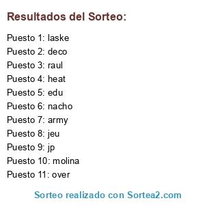 Lista de participantes: Joanpe, nacho, deco, molina, edu, over, laske, raul, heat, jeu, army.