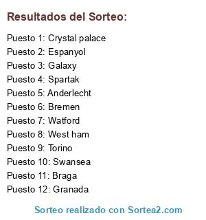Lista de participantes: West ham, Granada, Crystal palace, Galaxy, Swansea, Watford, Torino, Spartak, Braga, Anderlecht, Bremen, Espanyol.